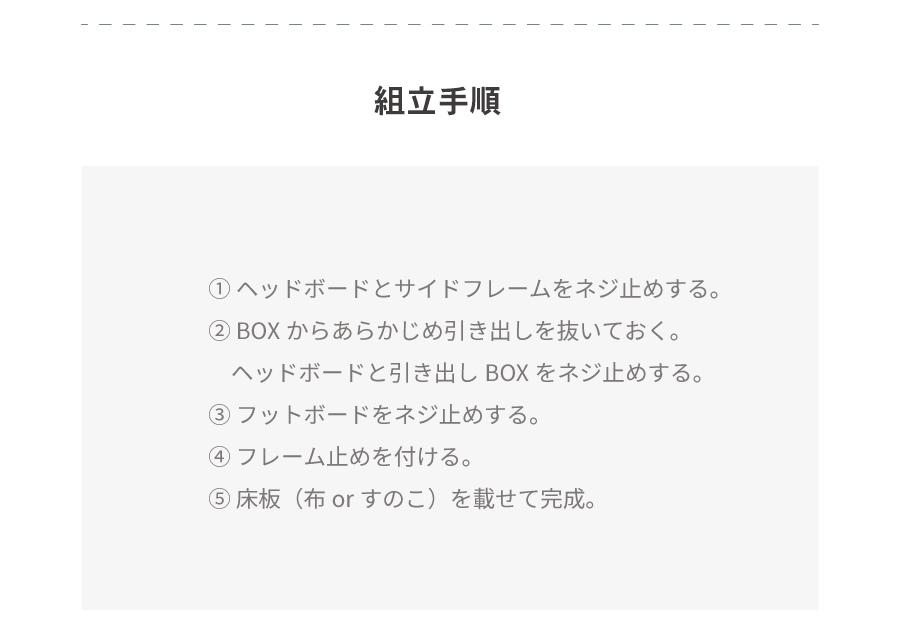 4個口 (SS/S/SD) (約) 4×(86/100/123)×33 [ヘッドボード] (約) 4×(86/100/123)×33 [フットボード] (約)49×(86/100/123)×10v床板] (約)33× 199×55 [引出BOX] | |