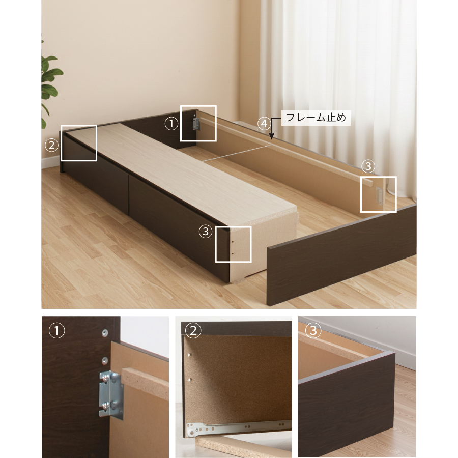 2杯の引出とフリースペースがあり、収納がたっぷり。狭い空間もスッキリ快適に!ご家庭のスペース問題を解決する、日本製の収納力抜群なベッドフレームです。スライドレール付きの2つの引出しと便利なフリースペースで、衣類や小物などをしっかり整理整頓。狭めの部屋でもスマートに使えて生活空間が広がります。 まるで魔法のよう!2杯の引出しと隠れたフリースペースがあなたの収納を劇的にアップデートこのベッドの最大の魅力は、引出し2杯に加えてフリースペースが設けられていること。引出しはスムーズなスライドレール仕様で開閉も楽々。季節ものの衣類や布団、生活用品まで多彩に収納可能です。フリースペースはカーペットや布団などの置き場所にちょうど良く、収納の幅を広げています。 職人の技が光る日本製ベッドで安心と高品質を手に入れる細部にまでこだわった国内製造ならではの信頼品質。丈夫なフレーム構造で長年使っても安心感が続きます。床面の高さは約30cmと設計され、マットレスを載せやすく、寝心地も損ないません。ヘッドレス仕様のためお部屋のレイアウトも自由自在にアレンジ可能です。 毎日の暮らしにフィット!大容量収納ベッドで部屋が整い心も豊かにお子さまの成長や家族のライフスタイルに合わせて、セミシングルからセミダブルまで幅広く対応。限られたスペースを最大活用し、床面の高さと収納機能が家族の快適生活をサポートします。引出し式収納で掃除や片付けも手軽になり、すっきりとした空間づくりに貢献します。 ご注意事項: