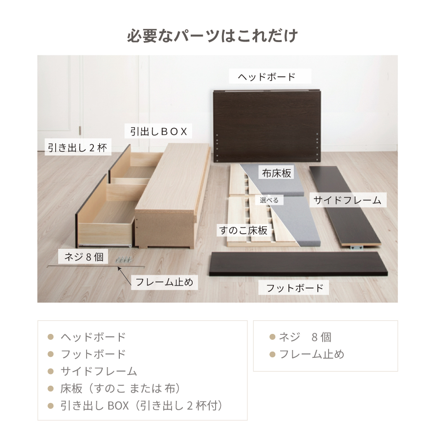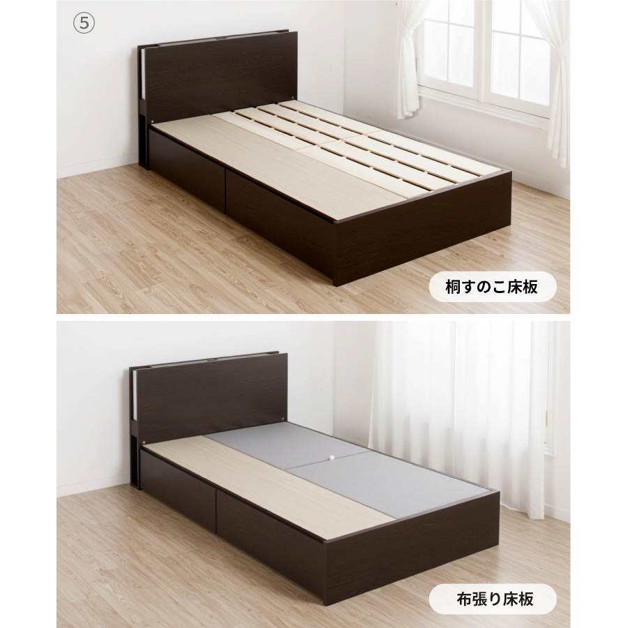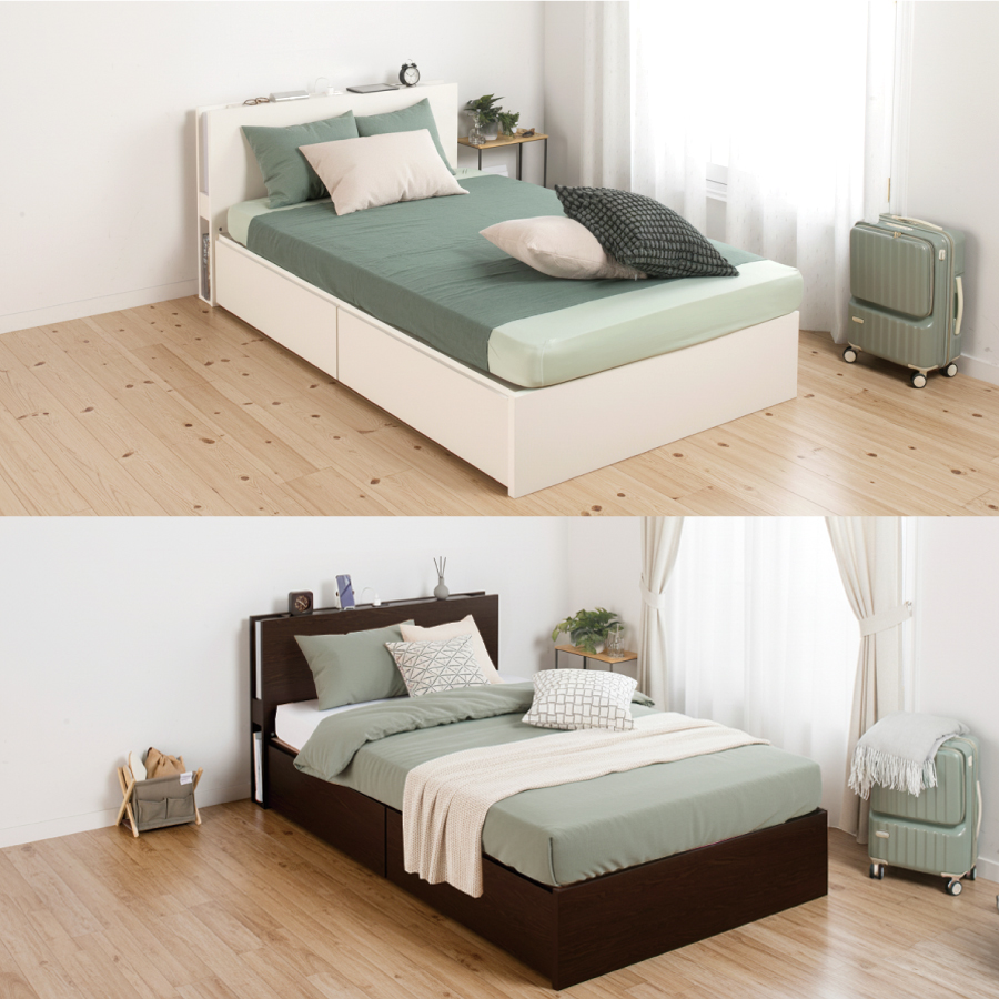 2杯引き出し。床板が選べるベッド。 ■カラー:2色 ブラウン・ホワイトの2色がございます。 ■床板:2種類 布床板・桐すのこの2種類がございます。 ■BOX構造:引出し2杯 引出しはスライドレール付きで、スムーズに開閉できます。 長物収納庫は大きくてかさばるものもスッポリ入る大容量収納が魅力のベッドです。 引出しは左右どちら側にも設置可能です。 *マットレスは別売りです。 こちらのベッドにはスプリングマットレスをお使いください。 (H300シリーズ、ファミリーベッドシリーズのスノコはマットレス専用となります。) *床板(フェルト布)色について 製造ロットにより、床板フェルト布色が異なることがあります。 (グレー、ベージュ、アイボリー等)お選びいただくことが出来ませんのでご了承願います。 【組立式】※プラスドライバー使用 |