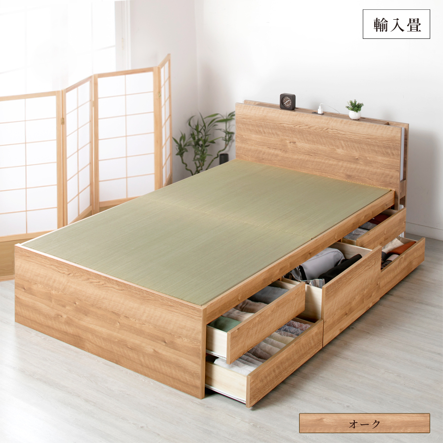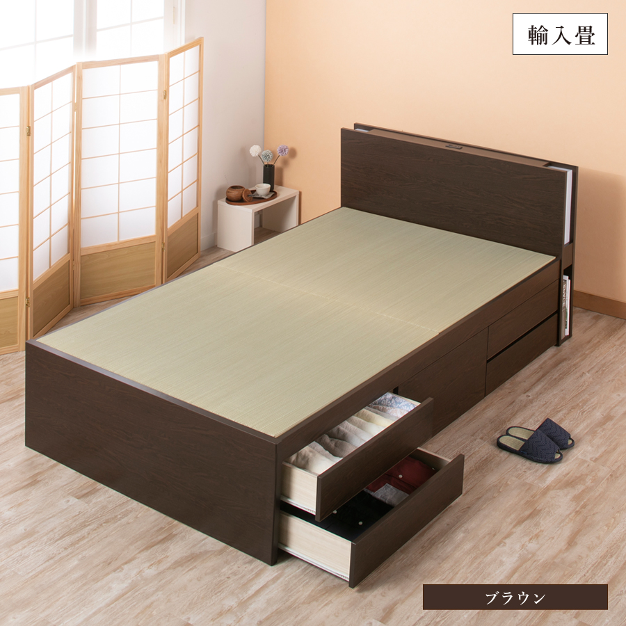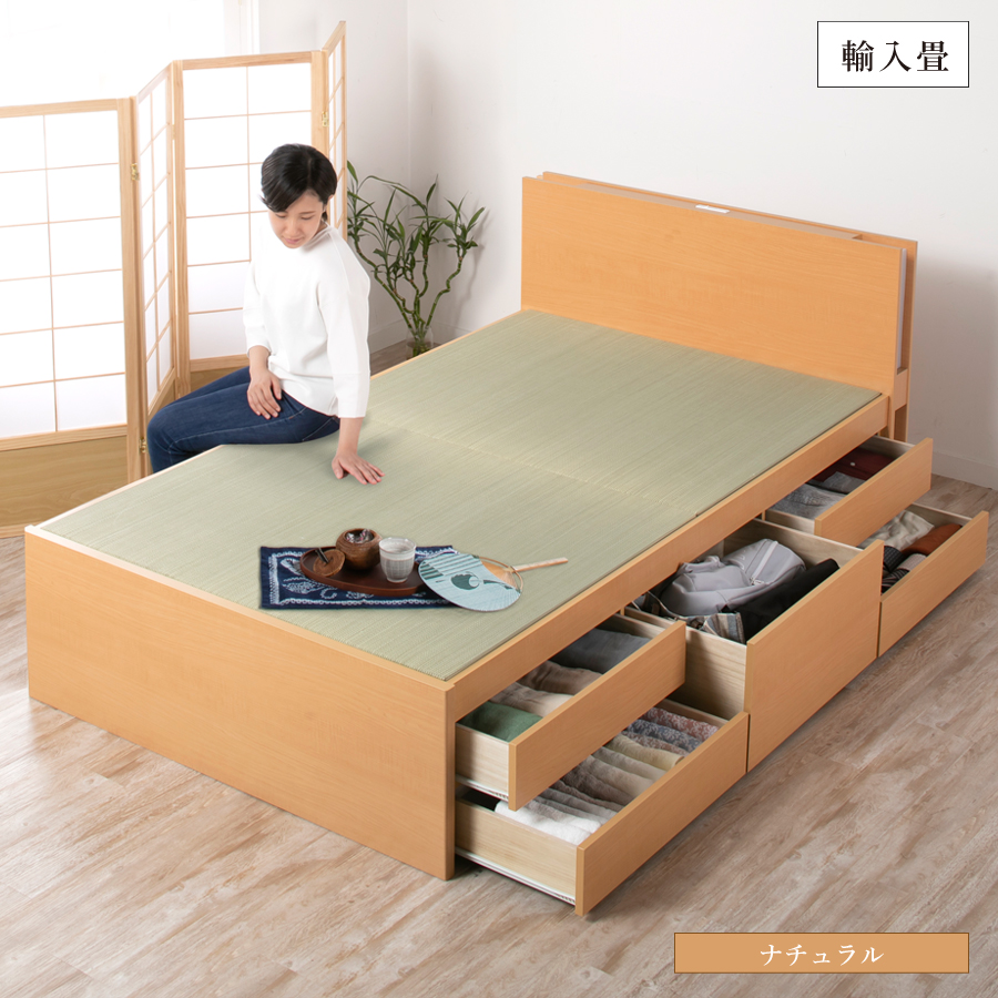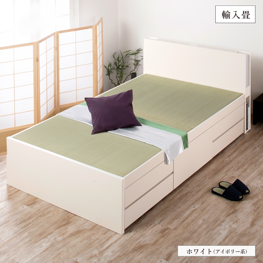 引出しは左右どちら側にも設置可能です。 ほのかな明かりが寝室を照らす照明付き。 コンセント付きカウンタータイプです。 ヘッドボード下部は雑誌が立てて置ける収納棚付き。 ベッド本体の引き出しはスライドレール付きで開閉が楽々 浅型引出し4杯・深型引出し1杯。長物収納付きです。 断熱性と保温効果のある畳。畳独自の弾力性も 心地よさのポイントです。 本品は敷布団・マットレスどちらでも使用可能です。 一部の地域を除き【送料込み】 ※プラスドライバー使用 |