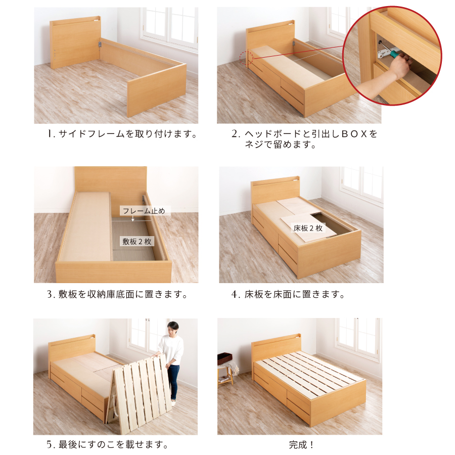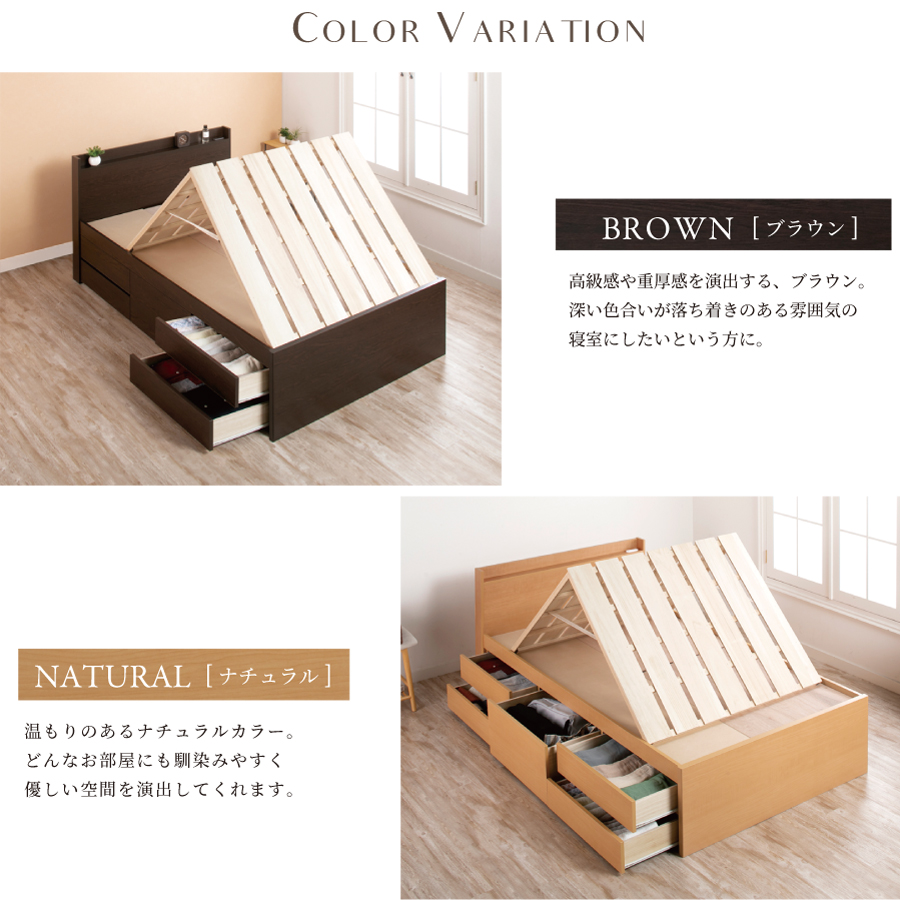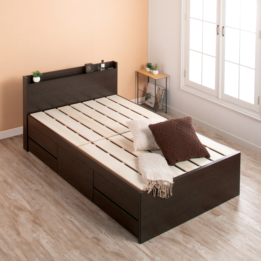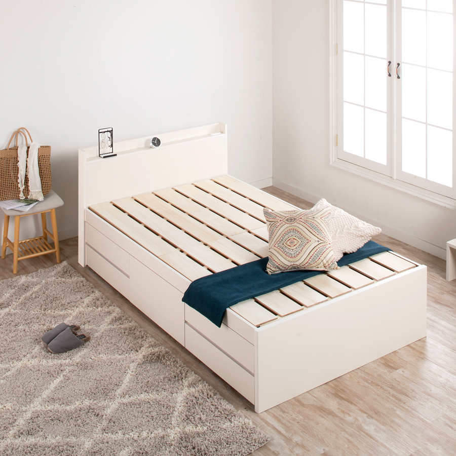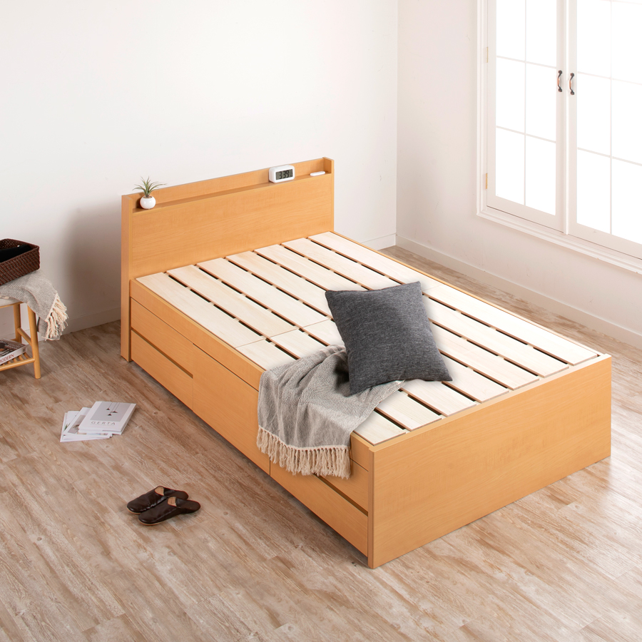 忙しい毎日を送るあなたにぴったりの、シンプルで機能的なベッドです。薄型のプレーンタイプヘッドボードは圧迫感がなく、お部屋を広々と見せます。その上、通気性抜群の桐すのこが布団をしっかり乾燥させるので、いつでも清潔な環境でお休みいただけます。600リットルの大容量収納庫は、スライドレール付きの5杯引き出しで重たいものもスムーズに整理。日々の生活をより便利に、快適にサポートします。