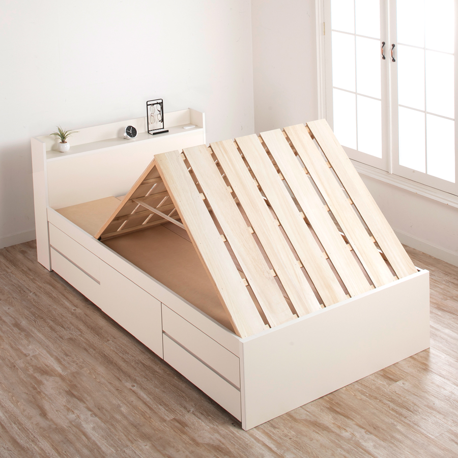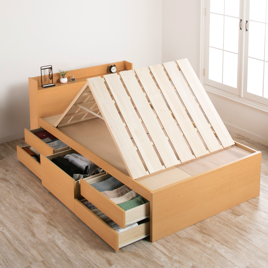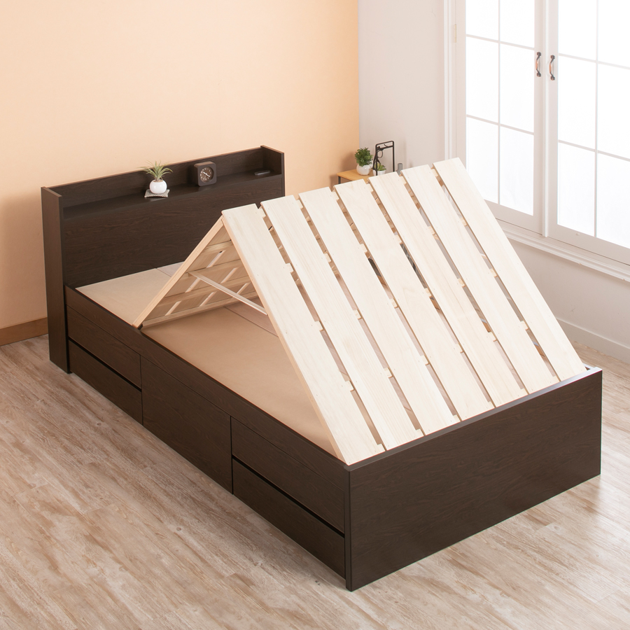 桐すのこで叶えるお布団の衛生的なケア日本製の桐すのこは天然素材ならではの通気性に優れ、布団の湿気を自然に逃します。これにより空気の循環を促進し、ダニやカビの発生リスクを軽減。布団をそのまま干すことができる「物干し」機能としても使えて、日頃のお手入れが手軽に行えます。山折りタイプなので、布団の出し入れがスムーズで省スペース収納にも寄与します。 600ℓを誇る圧巻の収納スペースで暮らしをスマートに5杯の引き出しに加え、大容量のBOX型収納スペースを備え、最大600リットルもの収納力が魅力です。衣類や季節用品、雑多なアイテムもたっぷりとしまえるため、居住空間をすっきりと保てます。セミシングル、シングル、セミダブルの3サイズとブラウン・ナチュラル・ホワイトの3色展開により、ライフスタイルやお部屋の雰囲気に合わせて選べるのもポイントです。 ※ご使用の際は湿度の高い環境を避け、定期的な換気を心がけてください。 上質な製造と配慮が息づく、毎日を彩る収納付きベッド上質な木材を用い、日本の高度な技術で丁寧に仕上げられたこの収納付きベッドは、使う方の暮らしに細やかな気配りを届けます。重厚感あるヘッドボードと機能的な収納が融合し、寝室空間を整え、生活の利便性を高めます。布団のケアがしやすい桐すのこは、環境にも優しく、長く愛用できる設計。省スペースな設計ながら存分に収納力を発揮し、身の回りをすっきり整頓できます。落ち着いた色味とサイズ展開で幅広いニーズに応え、日々の快適さを支える頼もしい相棒となることでしょう。 *マットレスは別売りです。【組立式】※プラスドライバー使用 ■本体サイズ■ セミシングル