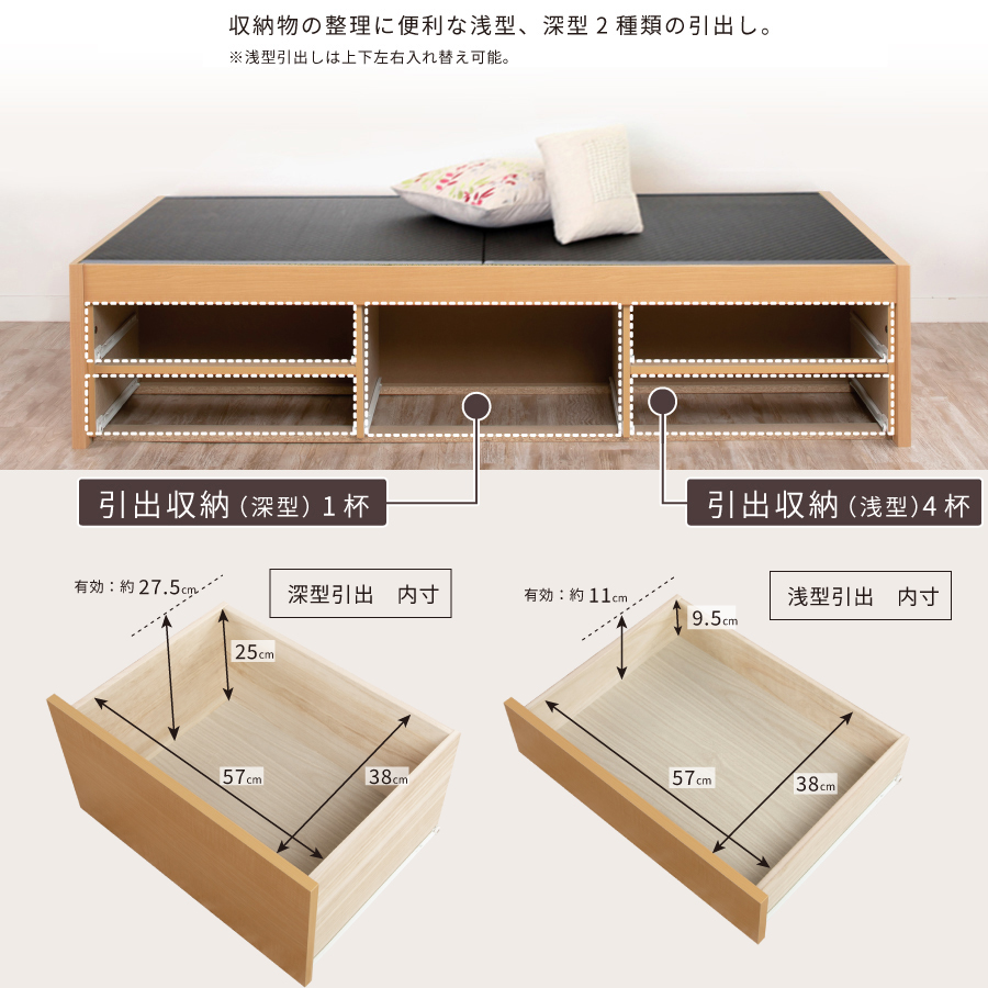シングル :幅96×長さ199.5(床面196)×高さ80cm(畳床面41cm) 総重量:約74kg セミダブル:幅120×長さ199.5(床面196)×高さ80cm(畳床面41cm) 総重量:約82kg 引出内寸(大):幅57×奥行38×深さ25cm/(小)幅57×奥行38×深さ9.5cm 収納庫有効内寸:幅(S:44/SD:66)×長さ193×深さ36cm 畳サイズ シングルサイズ :約96.2×92.5×厚み3cm…2枚 セミダブルサイズ:約114.5×96.5×厚み3cm…2枚 |