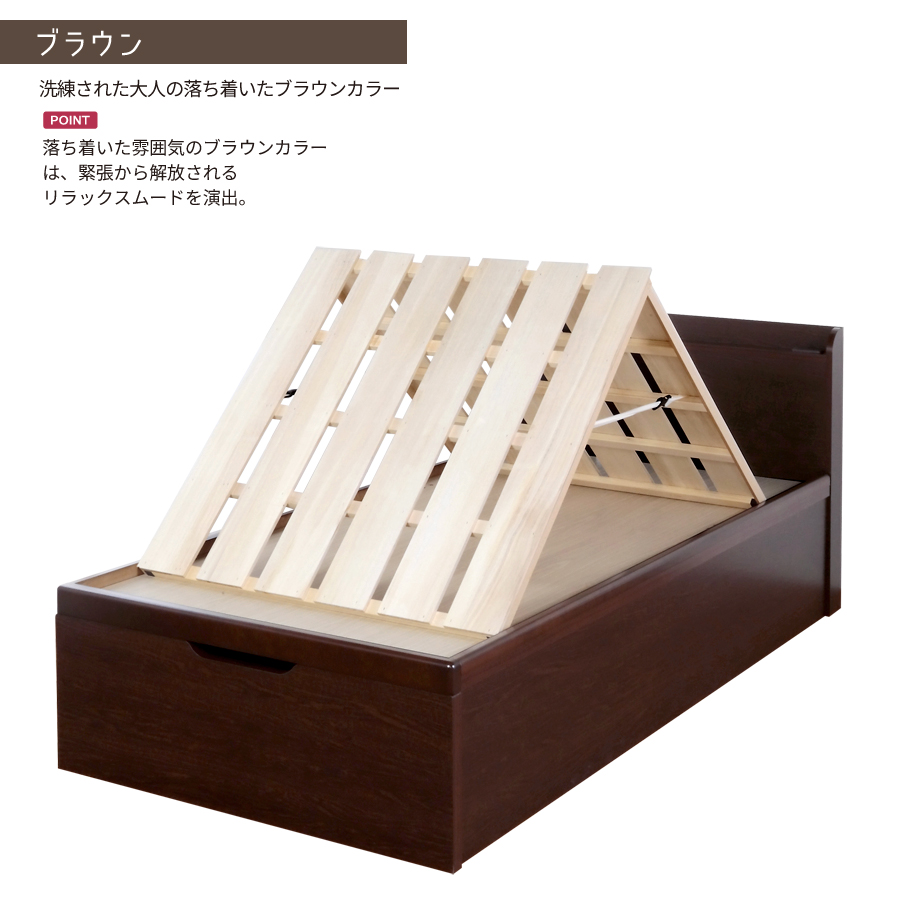 布団が干せる大容量収納「桐すのこ」ベッド! 山型にスタンドして布団の部屋干しが可能です。花粉の季節や梅雨時期の布団の湿気対策に活躍します。 ベッドフレームはガス圧式で、床板の上に布団をのせたままで重量のある床板の開閉をサポートいたします。 収納庫は仕切りをなくした仕様のためシーズンオフの寝具類や、じゅうたん、カーペット、茣蓙などの長物も収納OK! デッドスペース(引出すスペース)が無いのでスペースを有効活用できます。 シリンダー部分はガード付きで、収納物を挟む心配もございません。安心してお使いいただけます。 |