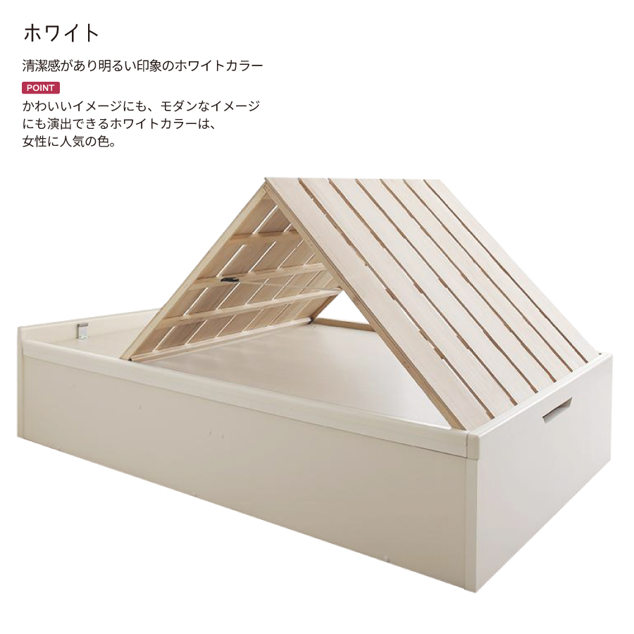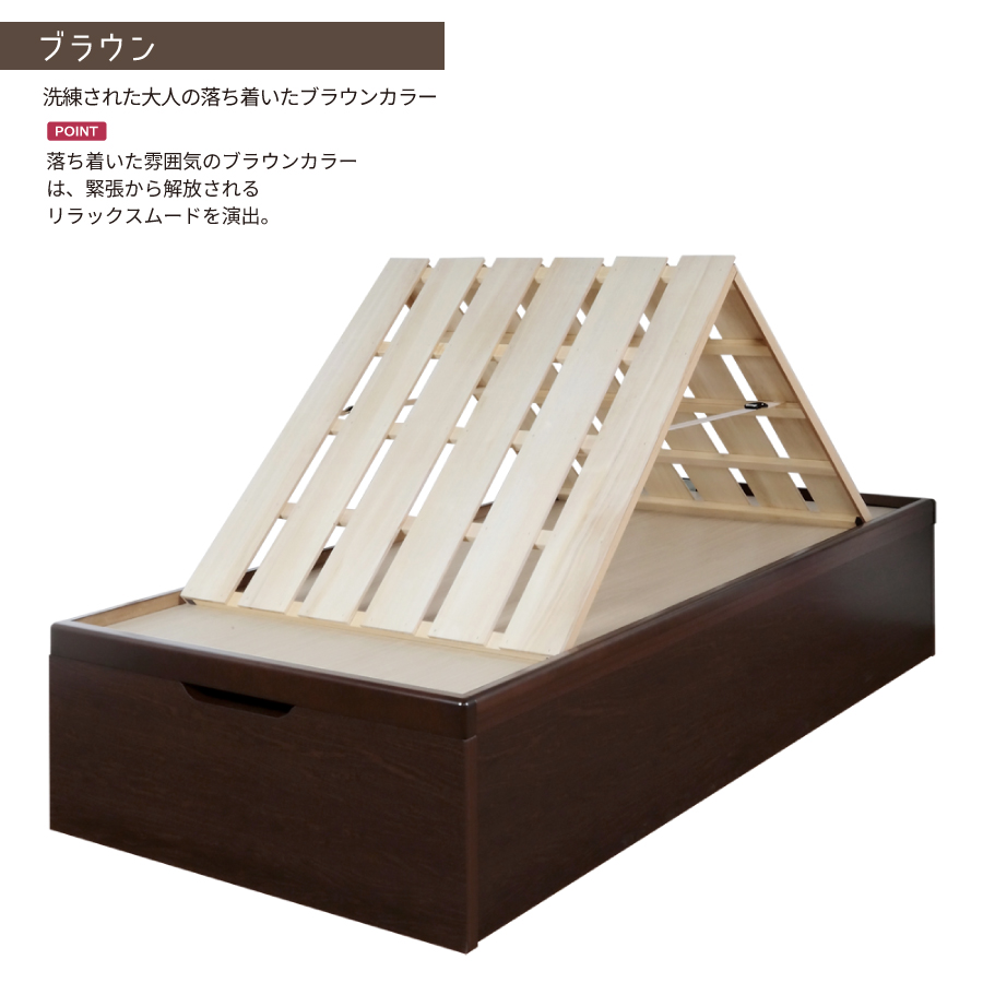 布団が干せる大容量収納「桐すのこ」ベッド! 山型にスタンドして布団の部屋干しが可能です。花粉の季節や梅雨時期の布団の湿気対策に活躍します。 ベッドフレームはガス圧式で、床板の上に布団をのせたままで重量のある床板の開閉をサポートいたします。 収納庫は仕切りをなくした仕様のためシーズンオフの寝具類や、じゅうたん、カーペット、茣蓙などの長物も収納OK! デッドスペース(引出すスペース)が無いのでスペースを有効活用できます。 シリンダー部分はガード付きで、収納物を挟む心配もございません。安心してお使いいただけます。 |